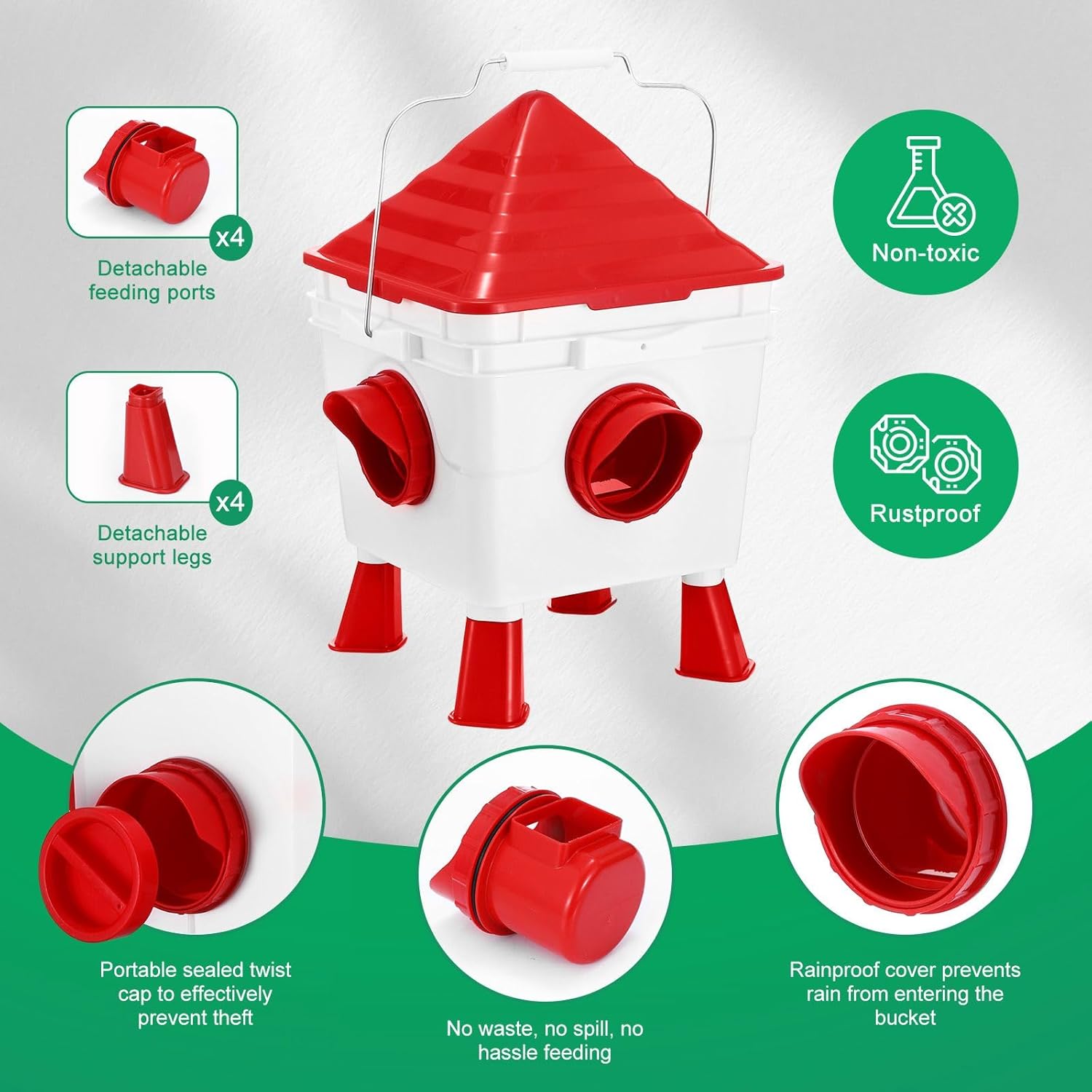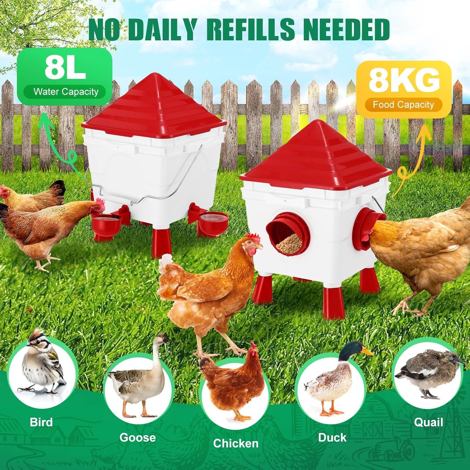 CARLA HOME Chicken Feeder Waterer Set, Automatic Gravity Dispenser with 8KG Food & 8L Water Capacity, 4 Ports & Cups, Clean Poultry Feeding for Coop, Duck, Quail, Hen This item stands out for the following characteristics: EASY, MESS-FREE FEEDING: This automatic chicken feeder set includes 4 feeding ports and 4 water cups, designed to reduce waste and keep your poultry area clean. The gravity-fed system ensures continuous access to dry food and clean water with no daily refills needed. GENEROUS 8KG + 8L CAPACITY: With an 8KG food bucket and 8L water reservoir, this poultry feeder and waterer set minimizes refill frequency—perfect for busy poultry keepers or weekend trips away. Supports chickens, ducks, quail, geese, and more. CLEAN & RAINPROOF DESIGN: Elevated legs and anti-roost cone lid protect feed from rain, dirt, and pests. This smart design keeps food dry and water fresh, ensuring healthier poultry and less maintenance for you. SAFE, DURABLE MATERIALS: Crafted from non-toxic, rustproof, and UV-resistant plastic, this feeder and drinker set is built for long-term indoor or outdoor use. The smooth surfaces and detachable components make cleaning a breeze. Key features: Item Dimensions: 50 x 50 x 32 cm. Item weight: 2.2 kg. Package Dimensions: 42 x 29 x 23 cm. Package weight: 2.53 kg. The box includes the product and all its components and a simple instruction set. One product per package.